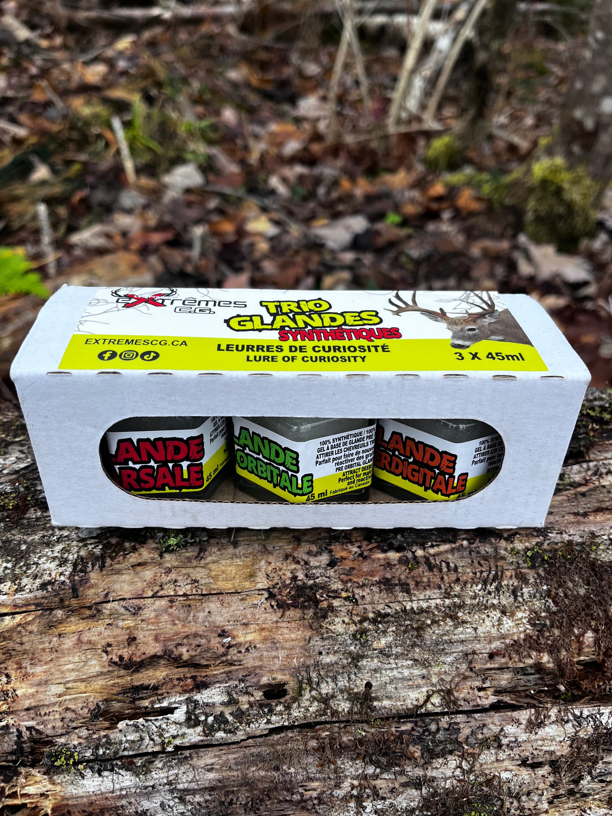 Le trio parfait, comprenant les trois glandes à utiliser pour déjouer votre gibier convoité. S'utilise directement et autour de vos grattés. Leurre synthétique de grande qualité. Voici les trois glandes incluses en format de 45ml chacun : Tarsale, Pré-Orbitale et Interdigitale. Taux efficacité supérieur et très provoquant pour développer des stratégies payantes!
